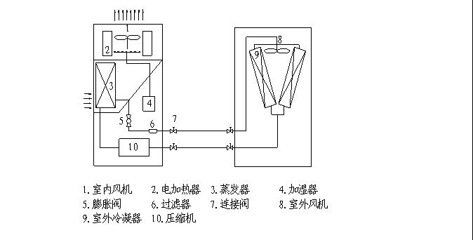 室外側翅片換熱器作為蒸發器,室內側翅片換熱器作為冷凝器,壓縮機排出的制冷劑高溫氣體在室內側翅片換熱器冷凝成液體后經膨脹閥節流降壓成為低溫氣體混合體,再流入室外側翅片換熱器吸收熱量蒸發后回到壓縮機,完成一個制冷循環;同時,從室內來的回風(或新風)經過室內側翅片換熱器(這時為冷凝器)后則被加熱升溫,處理后的熱風由室內側風機再送入室內。