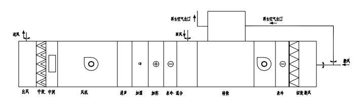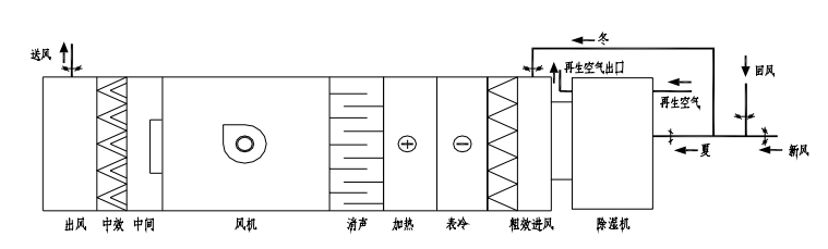 此系統中,夏季:溫度為 Tw 濕度為 RHw 的室外風經與室內風經一次回風混合后,達到某一狀態點3,進入轉輪除濕機,其出風狀態點為 4Rho 小于 4%T 達到 43℃左右),然后再經過表冷器干冷處理后達到狀態點 5,經風機溫升達到狀態點 6 后送入室內,以保證室內狀態參數 TnRHn。冬季:溫度為 Tw, 濕度為 RHw 的室外風經與室內風經一次回風混合后,達到某一狀態點 3,取一部分回風進入轉輪除濕機,其出風狀態點為 4Rho 小于 4%T 達到 43℃左右),再與未經過除濕機的回風經二次回風混合后達到混合點 6,然后經蒸汽加熱器處理后達到狀態點 7,經風機溫升達到狀態點 8 后送入室內,以保證室內狀態參數 TnRHn。此類系統可以提供 RHn=2%~30%的環境參數,常用于濕度要求較高的系統。