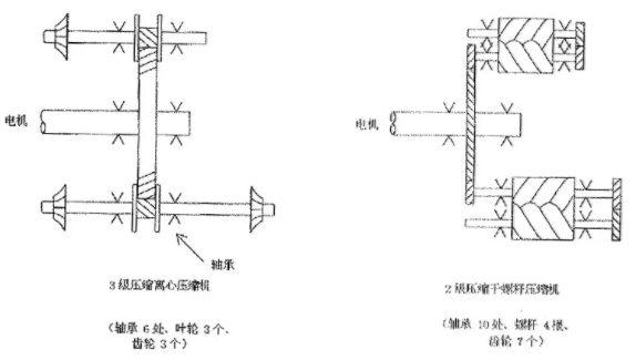干螺桿壓縮機的兩根螺桿以面相對,因此它的特點是稍稍接觸便會形成面接觸,引起發熱膨脹,燒焦并卡死,而另一方面,離心式壓縮機最大的特點,是葉輪葉片與蝸殼是以線相對,因此即使發生若干接觸也是線接觸,葉片如刀片般劃過,不會燒焦。因此,它最大的優點是事故比干式螺桿壓縮機要少得多。