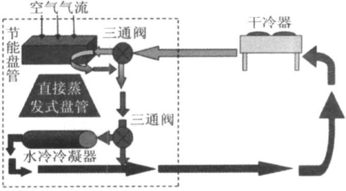 雙冷源機型可選擇冷水和壓縮機制冷系統(tǒng)來提供冷量。圖 3 為雙冷源機房空調(diào)機組安裝示意圖。雙冷源機型可以利用大樓廉價的集中空調(diào)冷水 ,節(jié)約大量運行費用。而在機房空調(diào)機組充分利用集中空調(diào)系統(tǒng)的制冷能力的同時 ,也由于增加了集中空調(diào)系統(tǒng)的負荷 ,可提高其運行效率。一般集中空調(diào)只是部分時間使用 ,而機房空調(diào)機組則需全天候運轉(zhuǎn) ,因此在集中空調(diào)冷水停供時 ,需啟動壓縮機制冷循環(huán)來提供冷量。