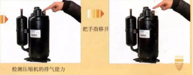 首先,將壓縮機卸下, 加電使其運轉,用手指堵住壓縮機的排氣孔片刻, 再將手指移開。 由于壓縮機內有壓力, 所以當用手堵住壓縮機的排氣孔時, 應感到有排氣壓力;當把手指移開時, 可以聽到 “呲呲的排氣聲, 而且排氣壓力正常的壓縮機,應很難堵住壓縮機排除的氣體,這表明壓縮機性能良好。如果用手堵住排氣管時感覺不到壓力, 將手指移開時,聽不到排氣聲, 則說明該壓縮機性能不良。如下圖所示: