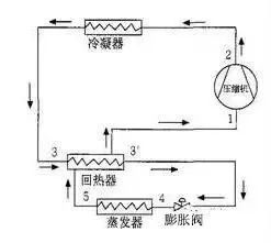 同時也加熱了回氣管的溫度,避免壓縮機吸入過潮蒸汽而可能產生液擊。毛細管節流的系統,毛細管與回氣管(吸氣管)合并在一起走,有合焊在一起的(大金VRV就是采用的此種方法),有用熱膠套套在一起的,有從回氣管中穿過的,還有纏繞在回氣管上的,也有的將毛細管或供液管直接在箱體內通過。毛細管與回氣管進行熱交換,使節流前的液態制冷劑與回氣管道中的低溫制冷劑蒸汽進行熱交換冷卻而得到過冷,這樣既可減少回氣管路中可能夾帶的液體液擊壓縮機,同時又能達到節流前液體制冷劑過冷的目的。當然還有采用回熱器的,原理也是一樣,請參見下圖: