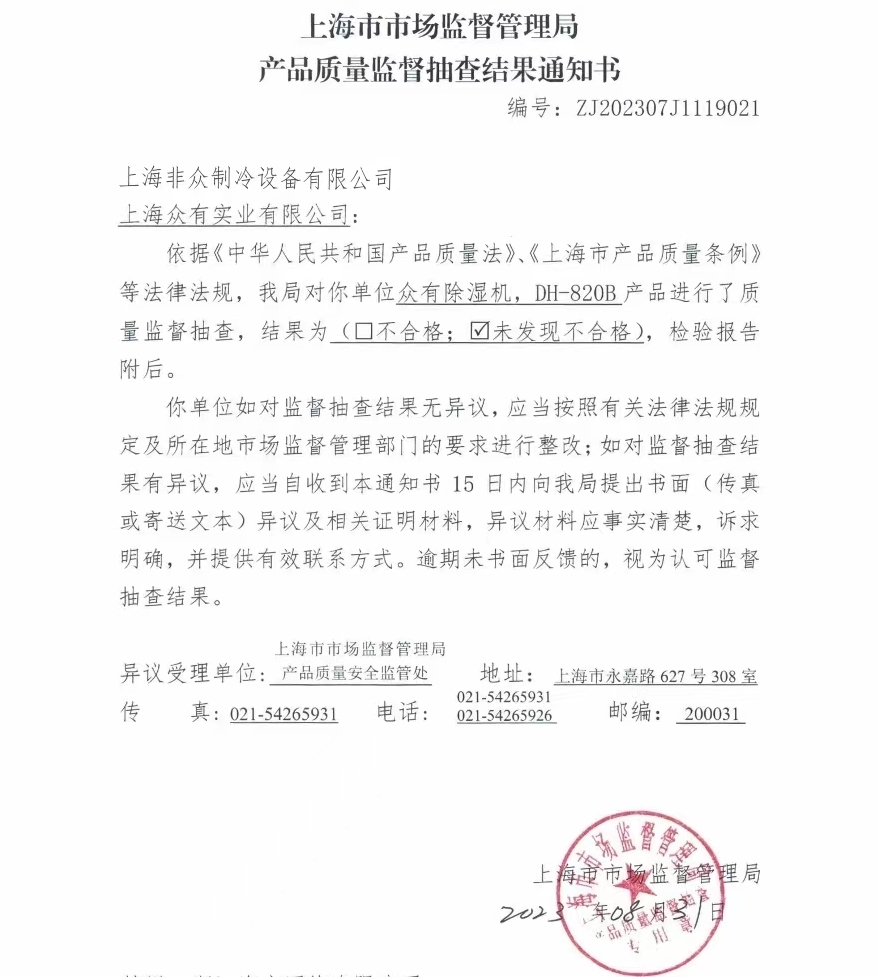 近日,上海市市場(chǎng)監(jiān)督管理局依據(jù)《中華人民共和國產(chǎn)品質(zhì)量法》、《上海市產(chǎn)品質(zhì)量條例》等法律法規(guī)對(duì)上海眾有實(shí)業(yè)有限公司的除濕機(jī)系列產(chǎn)品進(jìn)行了質(zhì)量監(jiān)督抽查,隨機(jī)抽查了DH-820B型號(hào)除濕機(jī)。此次抽查共檢驗(yàn)了“對(duì)觸及帶電部件的防護(hù)”、“耐潮濕”、“發(fā)熱”等21項(xiàng),報(bào)告顯示21項(xiàng)結(jié)果均為合格。