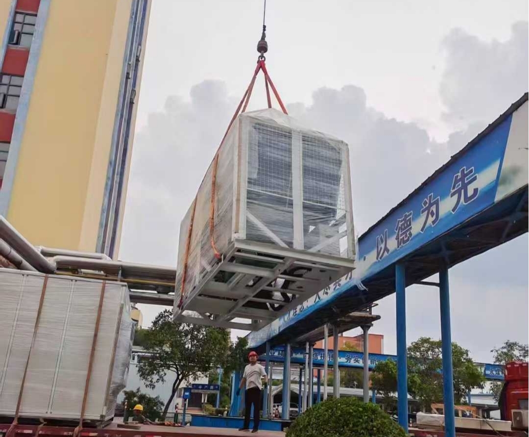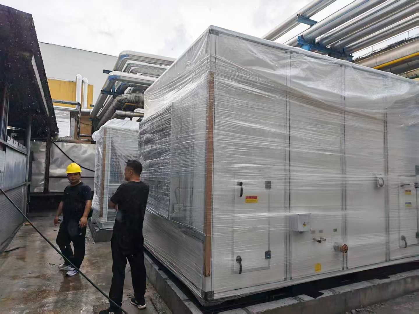 該設(shè)備在45000立方米/小時(shí)風(fēng)量下,可應(yīng)對(duì)溫度38℃、相對(duì)濕度90%及以下的氣候條件,除濕后出風(fēng)空氣含水量達(dá)25~31克/立方米,空氣溫度不低于10℃。設(shè)備總電源為三相四線380V、120KW,需配置約120平方電纜。