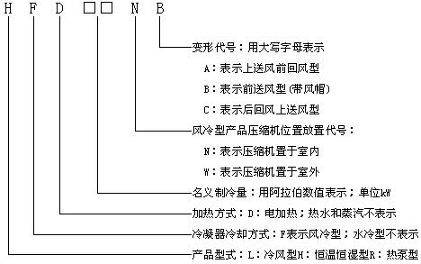 型號舉例:HF19N 表示名義制冷量為19kW的壓縮機置于室內的風冷型單元式空調機組。